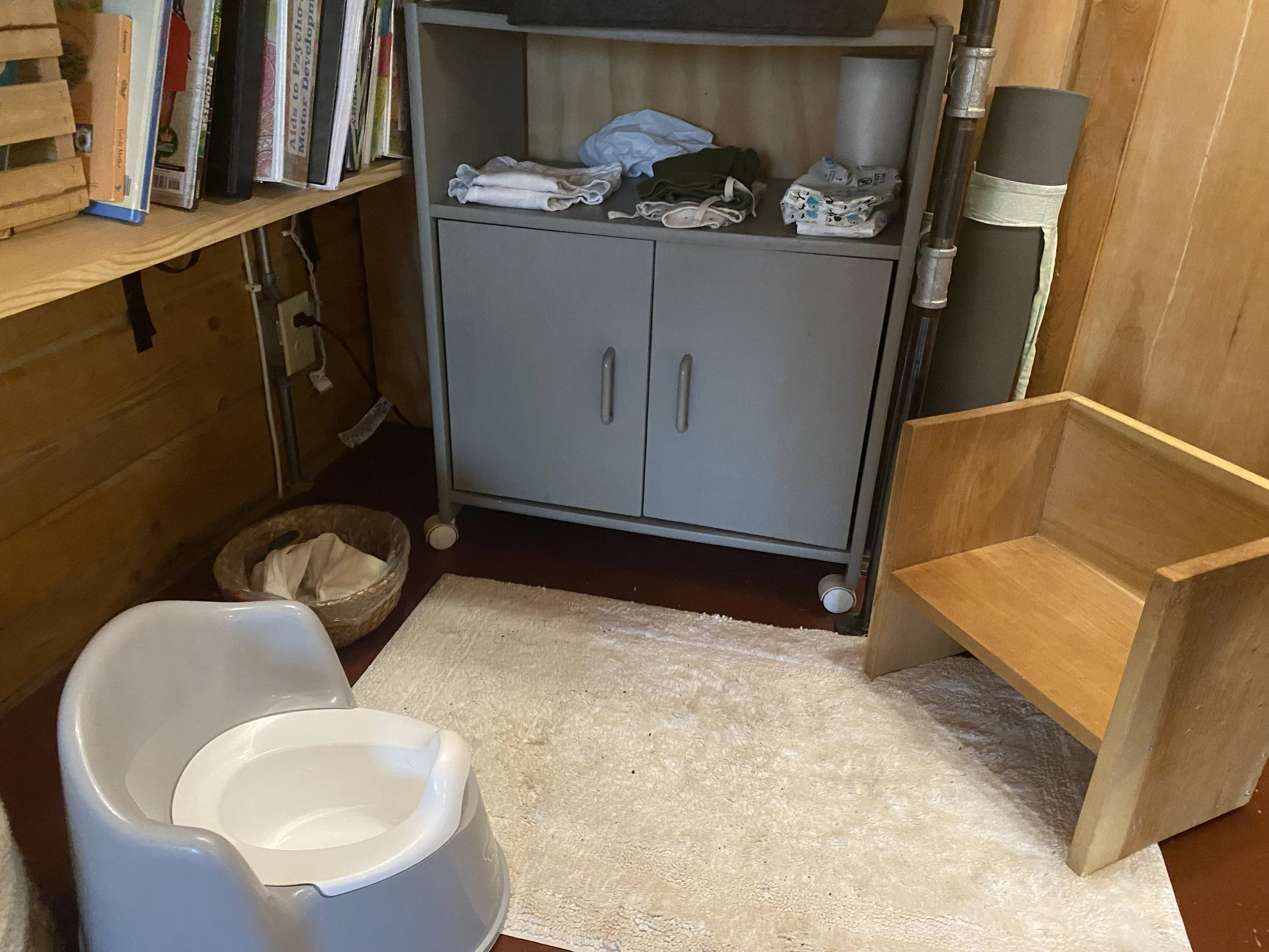 Once your child is walking and wanting to be upright, I encourage you to consider offering standing diaper changes that may or may not also include a small potty. Consider where diaper changes currently happen, is there a space nearby on the ground you can transition the process to that can accommodate a wobbly toddler, and all the necessary items you’ll need?